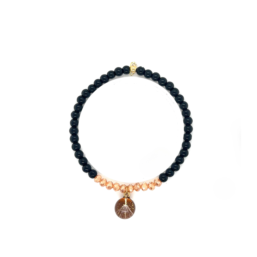 Ręcznie wykonana bransoletka, w której eleganckie czarne koraliki łączą się z subtelnymi brzoskwiniowymi kryształkami o pięknym połysku. Centralnym elementem jest zawieszka z zatopionym dmuchawcem w żywicy artystycznej, symbolizującym nadzieję, lekkość i spełnianie marzeń.