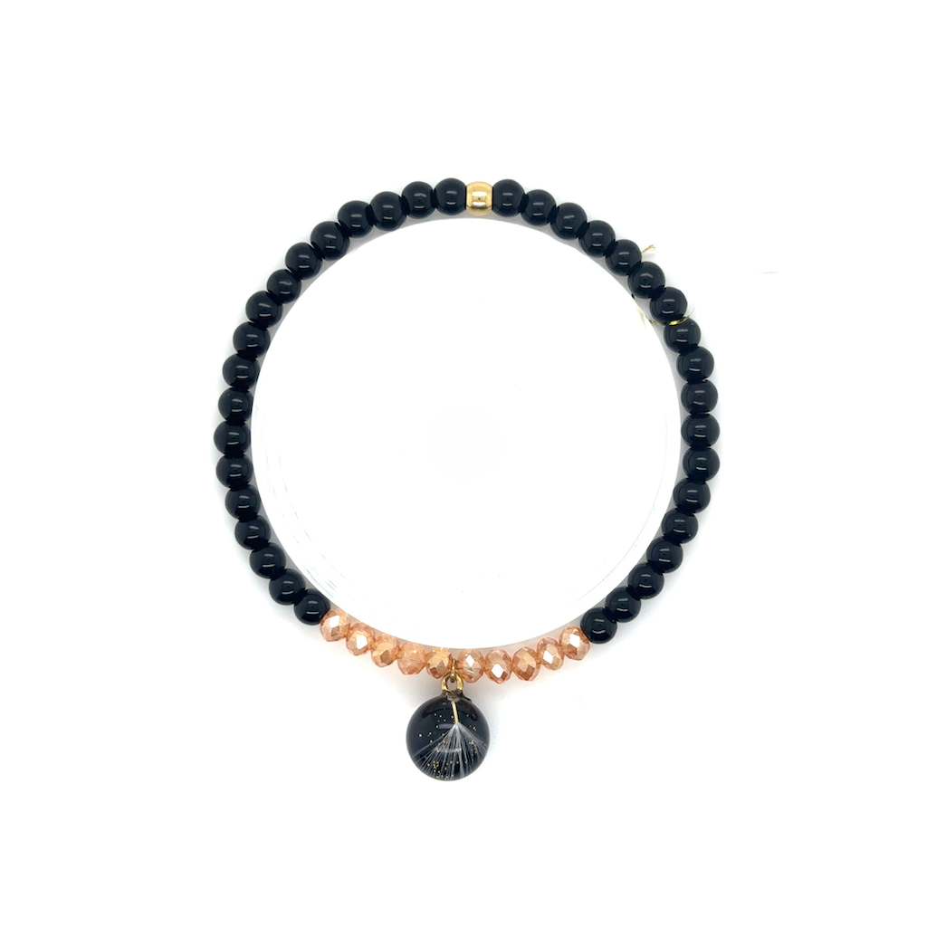 Ręcznie wykonana, delikatna bransoletka, w której eleganckie czarne koraliki połączono z subtelnymi, brzoskwiniowymi kryształkami o pięknym połysku. Centralnym elementem jest zawieszka z zatopionym dmuchawcem w żywicy, symbolizującym marzenia, lekkość i nadzieję. Każda bransoletka to unikalny egzemplarz wykonany z dbałością o każdy detal w pracowni BigDIAMOND Jubiler Kraków.