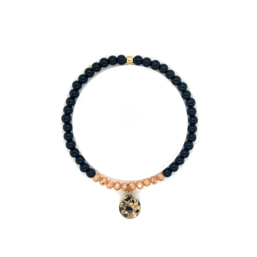 Ręcznie wykonana, elegancka bransoletka łącząca czarne, gładkie koraliki z subtelnymi brzoskwiniowymi kryształkami. Centralnym punktem kompozycji jest zawieszka z żywicy artystycznej, w której zatopiono płatki złota i czarne elementy dekoracyjne. Dzięki temu każda sztuka jest unikalna i przyciąga wzrok swoim naturalnym blaskiem.