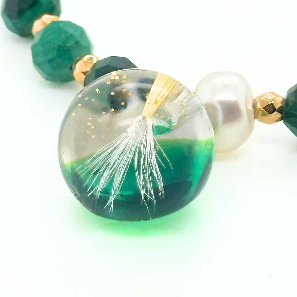 Bransoletka z zielonych kamieni i pereł z zawieszką z żywicy z dmuchawcem – BigDIAMOND Jubiler Kraków