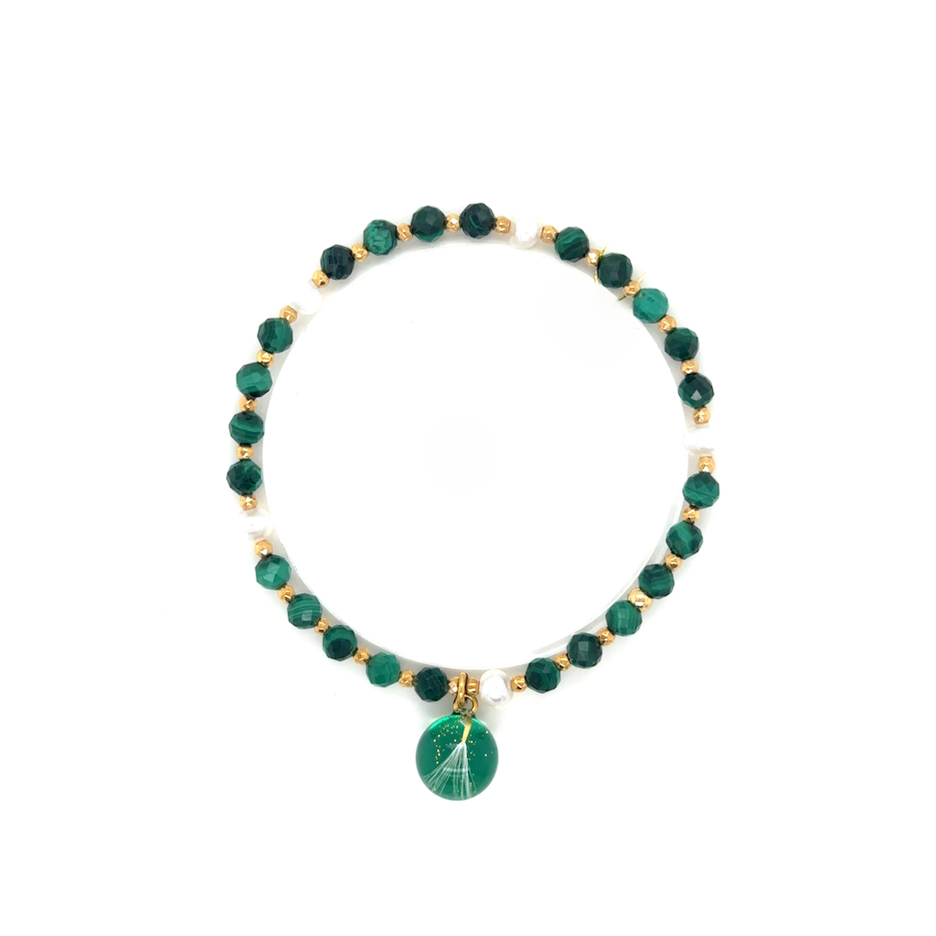 Elegancka bransoletka wykonana z zielonych, fasetowanych kamieni ozdobionych drobinkami złotych elementów i perełkami, uzupełniona okrągłą zawieszką z przezroczystej i zielonej żywicy, w której zatopiono prawdziwy dmuchawiec.