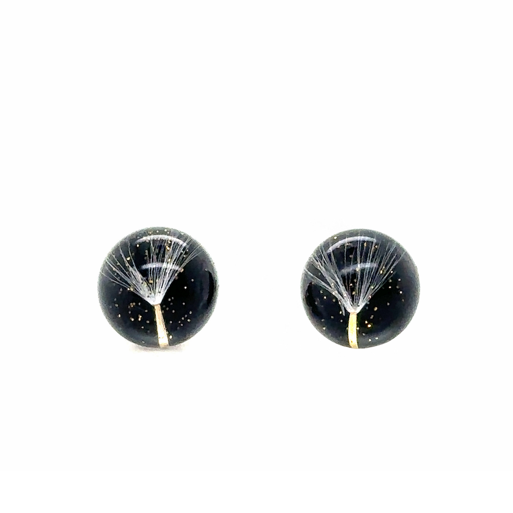 Minimalistyczne kolczyki w formie sztyftów z okrągłymi kulkami z czarnej i przezroczystej żywicy, w których zatopiono prawdziwy dmuchawiec oraz delikatne złote drobinki.