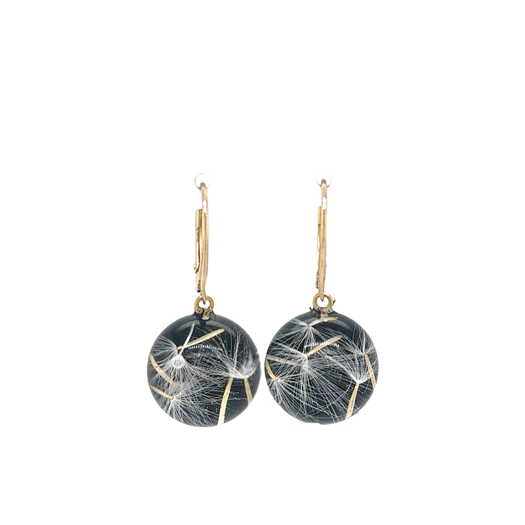 Subtelne kolczyki z przezroczystej żywicy artystycznej, w której zatopiono prawdziwe dmuchawce o delikatnej strukturze.