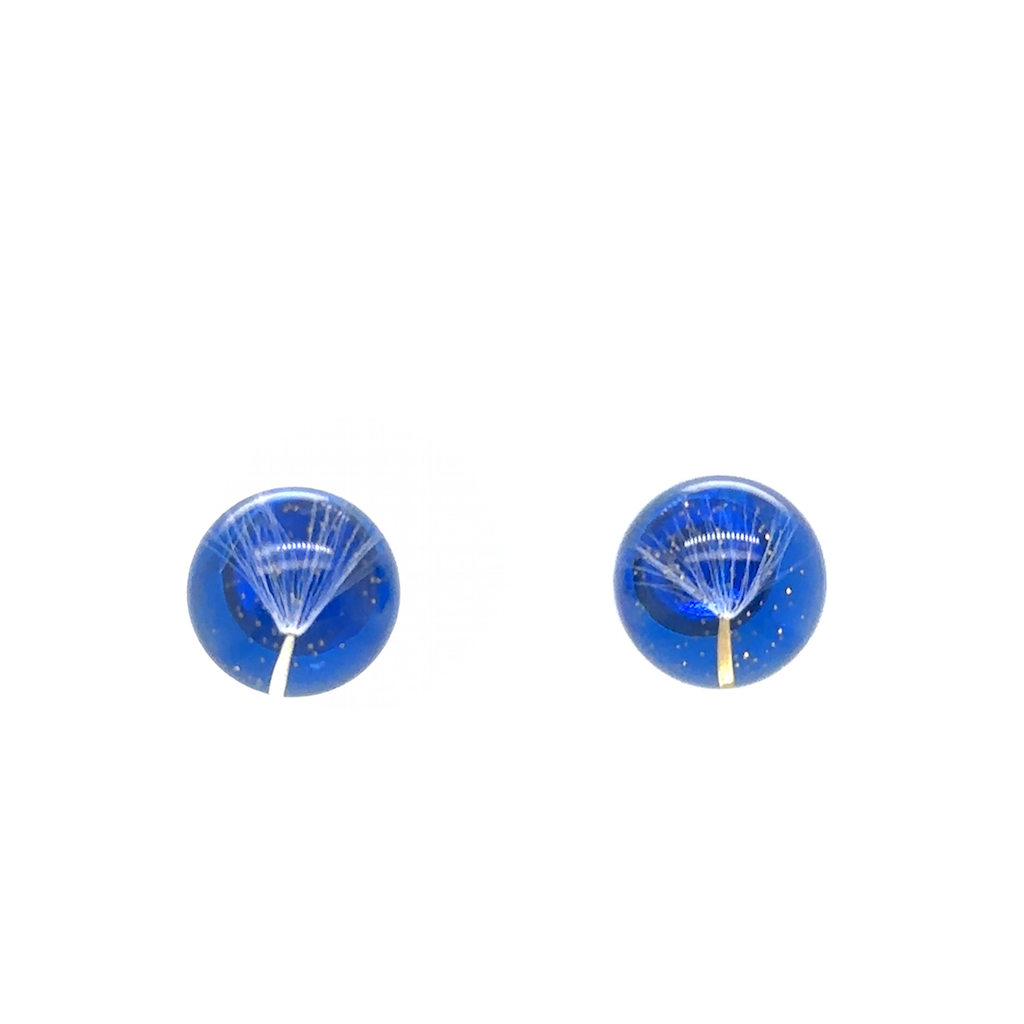 Subtelne kolczyki typu sztyft, wykonane z niebieskiej żywicy artystycznej, w której zatopiono nasionka dmuchawca.