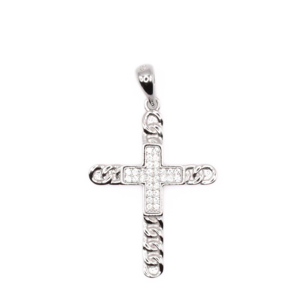 Krzyż ozdobiono precyzyjnie osadzonymi białymi cyrkoniami, które nadają mu elegancki połysk. Ramiona zdobi unikalny wzór ogniw łańcucha, co nadaje całości nowoczesnego i zdecydowanego charakteru.
