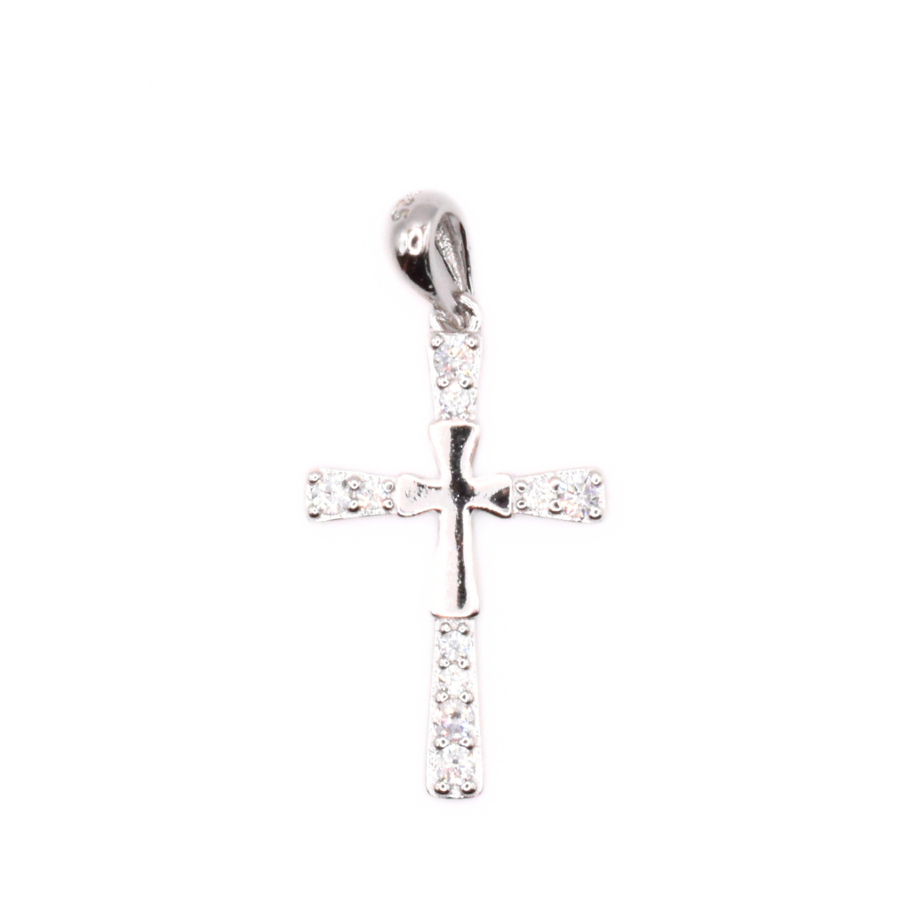 Delikatny wisiorek w kształcie krzyża wykonany ze srebra próby 925.
