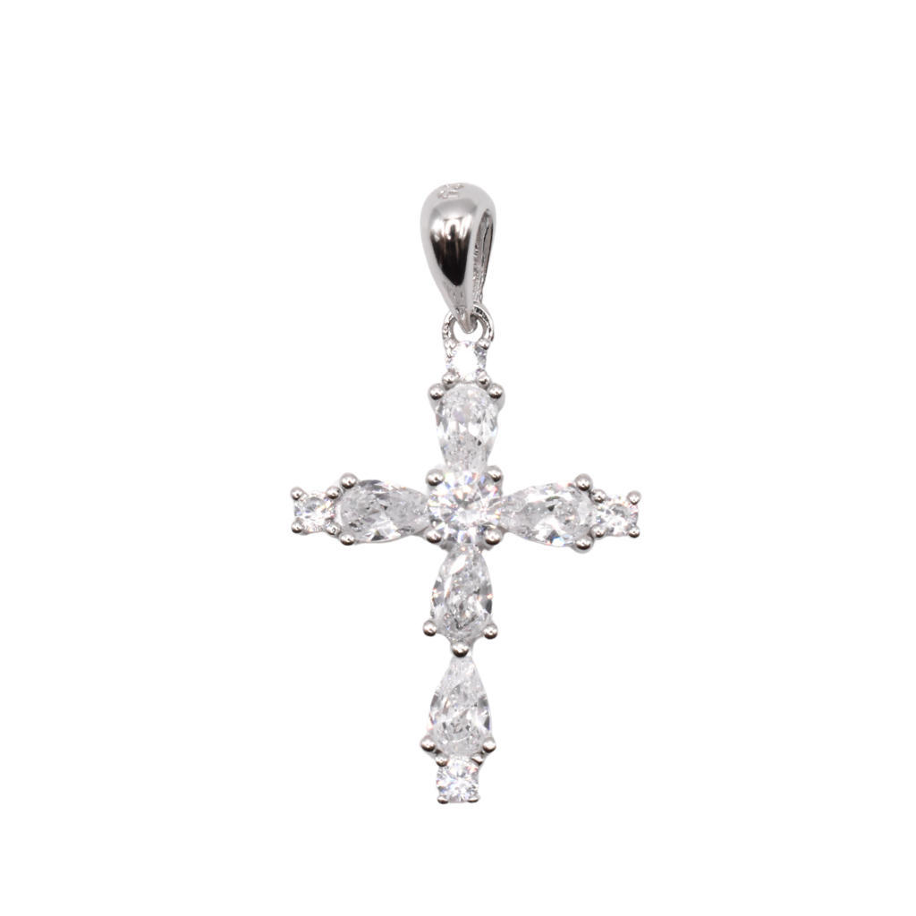 Każde ramię krzyża tworzą błyszczące cyrkonie w kształcie łez, osadzone w eleganckiej oprawie jubilerskiej.