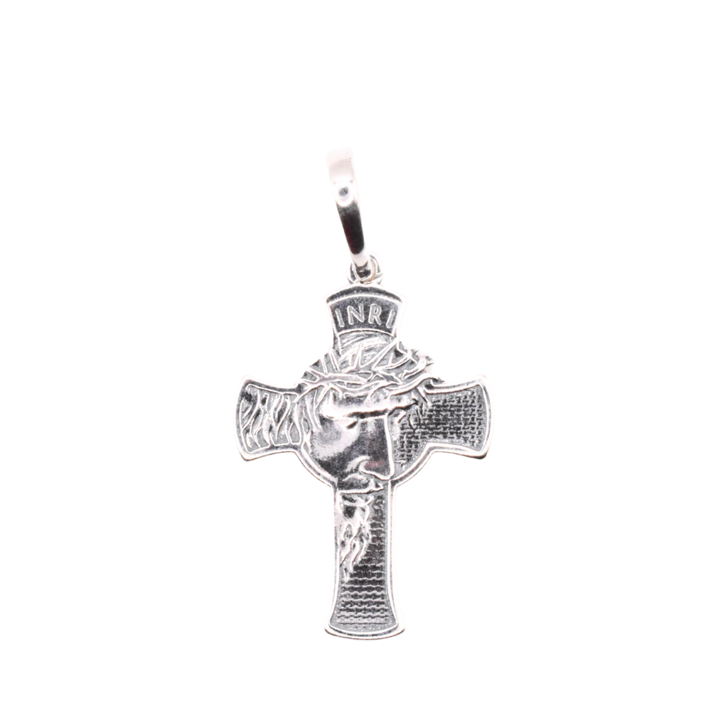 Tradycyjny srebrny krzyżyk przedstawiający profil Jezusa Chrystusa w koronie cierniowej, z wygrawerowanym napisem INRI u góry.