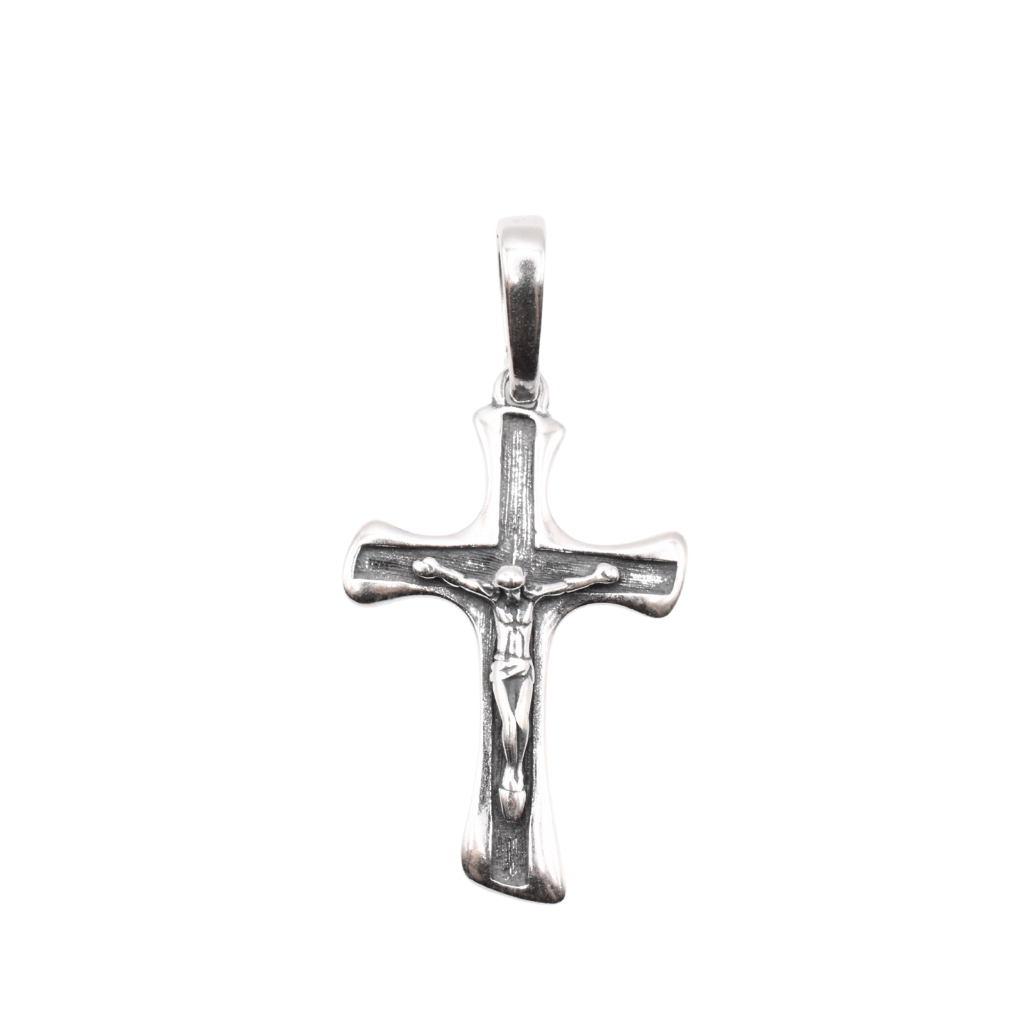 Klasyczny srebrny krzyżyk z wizerunkiem Jezusa Chrystusa, wykonany z najwyższej jakości srebra próby 925.