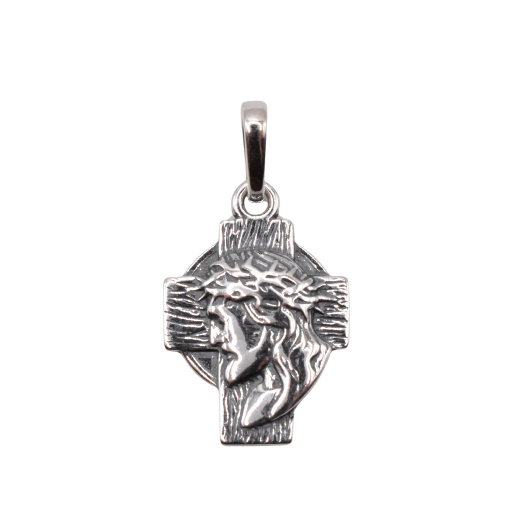 Tradycyjny srebrny krzyżyk przedstawiający profil Jezusa Chrystusa w koronie cierniowej.