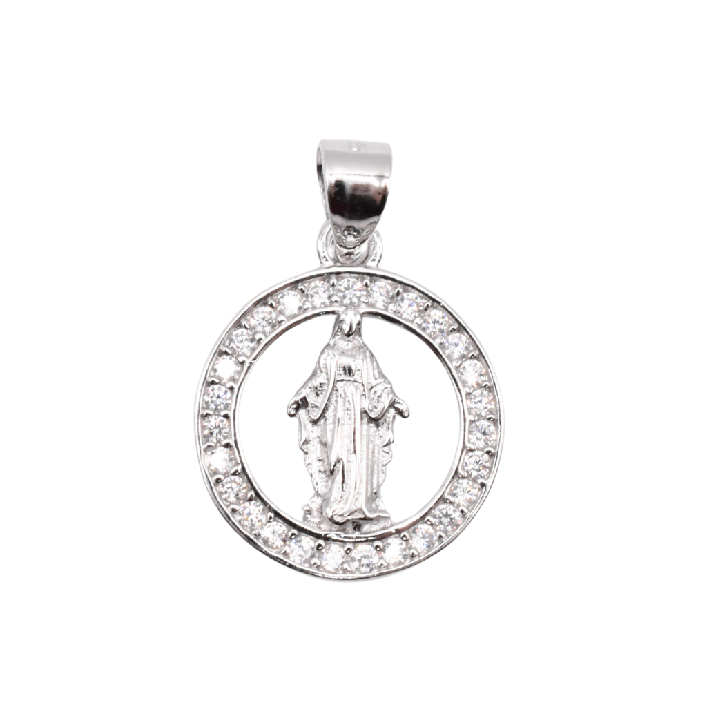 Wyjątkowy srebrny medalik z wizerunkiem Matki Bożej, osadzony w błyszczącym okręgu ozdobionym cyrkoniami, symbolizuje czystość, opiekę i duchową harmonię.